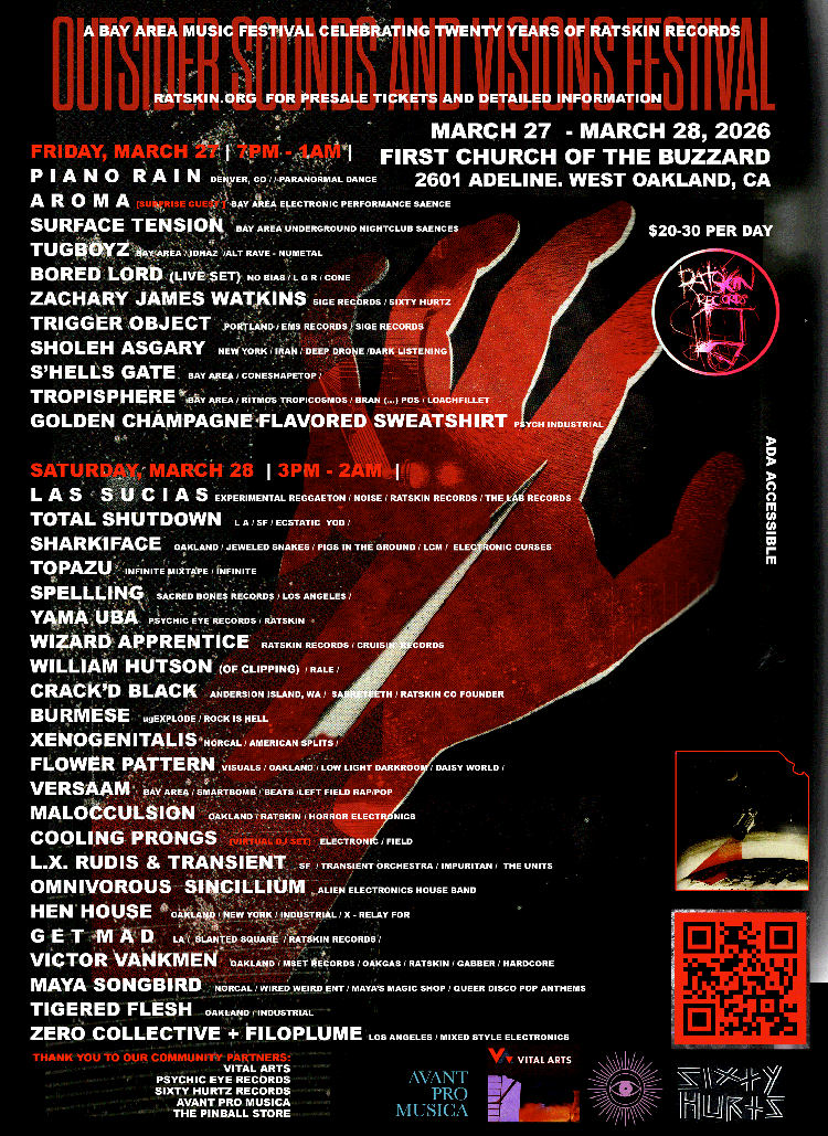 LAST MINUTE GIVEAWAY!! Win 2 free tickets to night one (Friday, March 27) of the Outsider Sounds and Visions Fest, celebrating the twenty year anniversary of Ratskin Records. Featuring Piano Rain, AroMa, Surface Tension, Tuboyz, Bored Lord, Zachary James Watkins, Trigger Object, Sholeh Asgary, S'hells Gate, Tropisphere, and Golden Champagne-Flavored Sweatshirt.